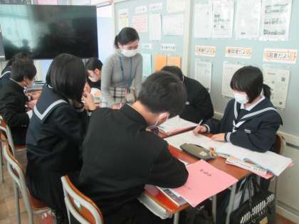 2年1組では、英語の授業で、比較級についての文法を学んでいました。グループワークに取り組みながら、積極的にALTに質問する姿が見られました。