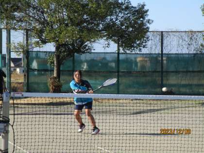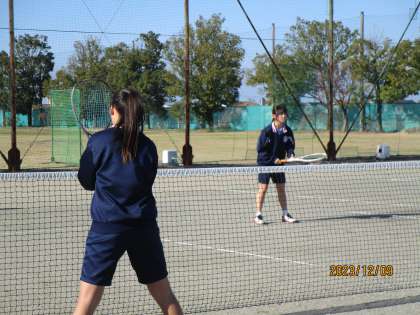 今日は暖かく、雲ひとつない青空の下、ソフトテニス部が練習に打ち込んでいます。ペアで試合をしています。1年生対2年生の組み合わせもあり、真剣勝負が繰り広げられています。