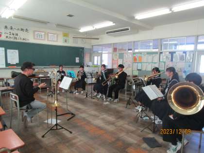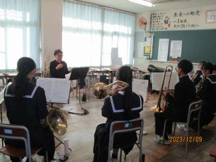 12月9日(土) 休日の部活動 吹奏楽部 公開日 2023/12/09 更新日 2023/12/09 news 吹奏楽部は、外部指導者をお招きして練習に励んでいます。先生のアドバイスを真剣に聞いています。