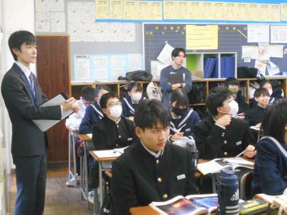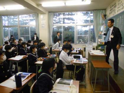 12月12日(火) 道徳校内研修会 公開日 2023/12/12 更新日 2023/12/12 news 本日6限、1年2組で道徳校内研修会の一環として、鍋田校長が教壇に立ち、自然愛護に関わる資料を使って示範授業を行いました。 若手教員を対象にした研修授業は、学びの多い時間となりました。 生徒たちは心を揺さぶられる発問に、真剣に考え、自由に思ったことを自然に発言していました。