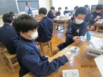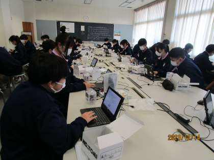 12月14日(木) 2年 プログラミングに挑戦! 公開日 2023/12/14 更新日 2023/12/14 2学年 2年2組の技術では、「オーロラクロック」を作成しています。木工室で時計を組み立てた後は、コンピューター室で各自が考えたプログラムを時計に入力するプログラミングをしました。 自分がプログラムしたように時計が虹色に作動する様子に大興奮の生徒たちでした。
