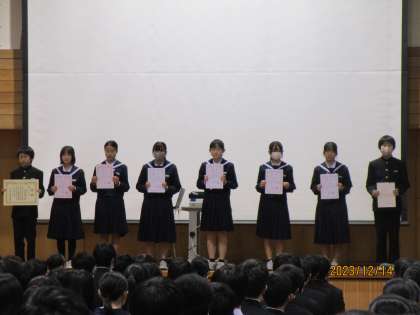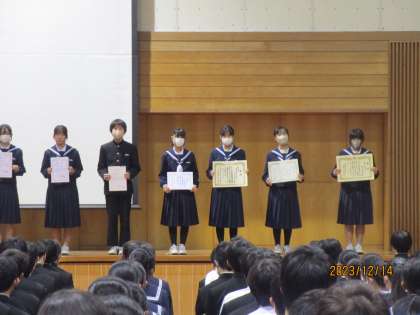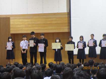 6限に全校で、受賞報告会を行いました。部活動や文化作品で多くの生徒が受賞し、その活躍を拍手で讃えました。
