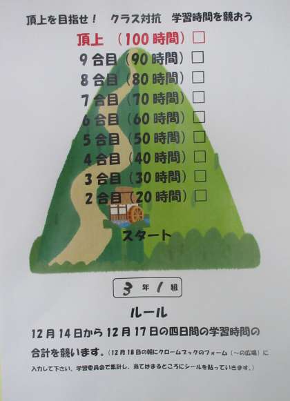 3年生では、「頂上を目指せ!クラス対抗 学習時間を競おう」に取り組んでいます。