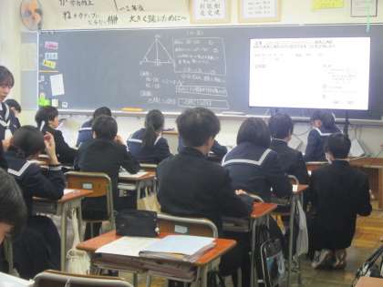 下段の写真は、2年2組の社会の授業風景です。北陸の産業と雪はどう関わるのかという課題でした。冬の産業として、高岡銅器や輪島塗が例に挙げられ、生徒たちは教師の解説を聞きながらノートにまとめていました。
