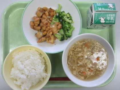 12月20日(水) 今日の給食 公開日 2023/12/20 更新日 2023/12/20 news 今日の給食のメニューは以下のとおりです。 ○ごはん ○牛乳 ○魚と大豆のねぎソースからめ ○ゆでブロッコリー ○中華かき玉汁 「中華かき玉汁」は、卵が具材によく絡んでいて美味しかったです。