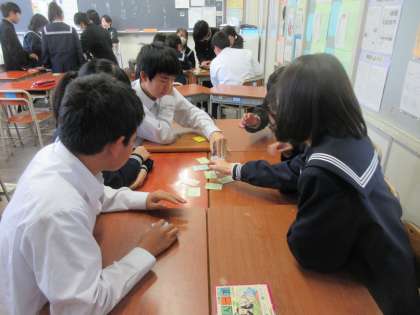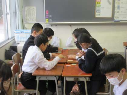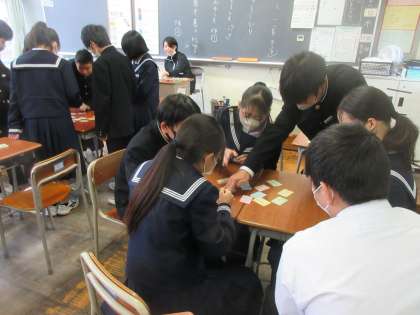 12月21日(木) 1年 授業風景 公開日 2023/12/21 更新日 2023/12/21 1学年 1年3組の国語の授業の様子です。 班ごとに百人一首を行いました。 教科担当者が上の句を読み上げると、一気に集中力が増し、札を取り合っていました。 みんな、とても楽しそうに取り組んでいました。