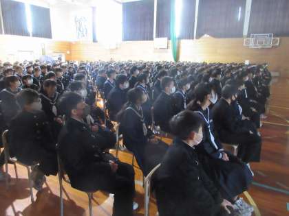 鍋田校長から、式辞の後、2学期を振り返って、生徒たちへ「頑張れ!」のメッセージを込めたスライドショーがありました。