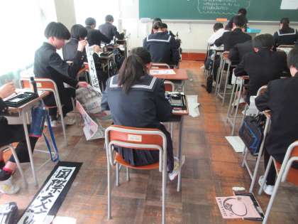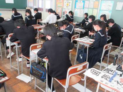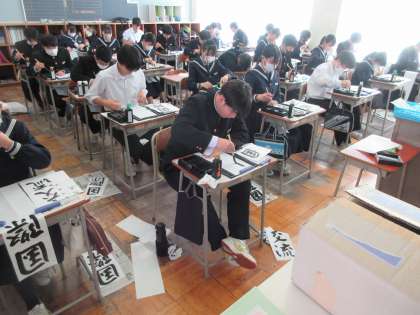 1月9日(火) 3年 書初大会 公開日 2024/01/09 更新日 2024/01/09 3学年 3年生は、中学校生活最後の書初大会となりました。 もしかすると、習字を書くことが、今後の人生でもう無いかもしれません。 これから全ての行事が「中学校生活最後の…」になります。 全てのことに気持ちを込めて取り組みましょう!