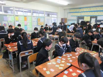 本日の4限目の授業の様子です。 教科は国語でグループに分かれて、百人一首をしました。