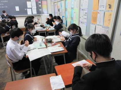 1月15日(月) 1年3組 授業風景 公開日 2024/01/15 更新日 2024/01/15 1学年 本日の4限目の授業の様子です。 教科は数学で正多面体をペーパークラフトし、その特徴を学習しました。