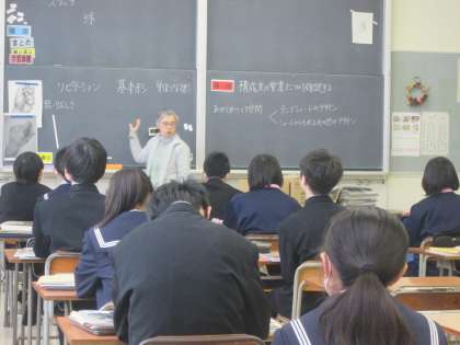 上段の写真は、2年3組の美術の授業風景です。構成美の要素についての学習で、どの生徒も真剣に教師の解説を聞いていました。