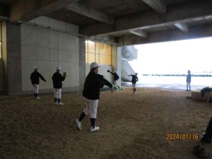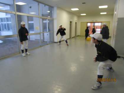 野球部は雪がちらつく中、ピロティーと廊下を使ってトレーニングやキャッチボールをしています。