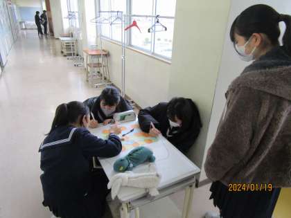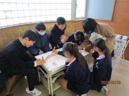 放課後の2年生教室では、生徒会企画の「玄関を明るくする運動」の掲示物を作成中です。