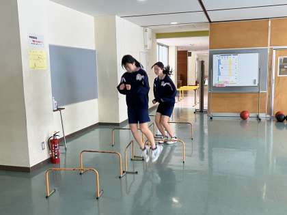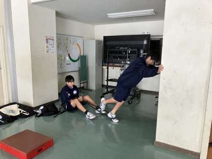 陸上競技部は、1階廊下をめいいっぱい使って、様々な種類のトレーニングをしています。冬のこの時期のトレーニングが、春の強さにつながるのですね!
