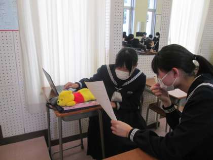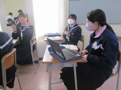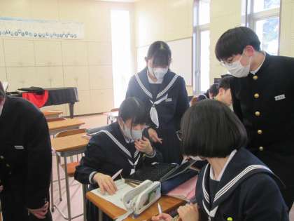 これまでに習った学習内容を振り返り、音楽を形づくっている要素をまとめました。おすすめの曲を紹介するために、まとめたことを参考にしながら書いている場面です。来週は、グループで自分が選んだ曲を発表し合う予定です。