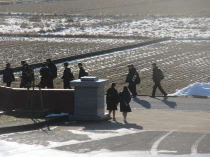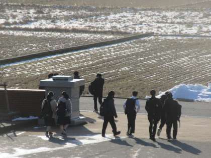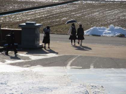 眩しいくらいの日射しで、雪解け水による路面からの照り返しも強く、下校する生徒たちは輝いていました。