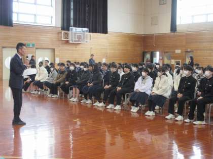 1月31日(水) 3年 入試前日に学年集会実施しました 公開日 2024/01/31 更新日 2024/01/31 3学年 明日2月1日は、私立一般入試です。 本日6限、3年生は学年集会を行い、入試に向けた激励会を行いました。 最初に鍋田校長の話がありました。 40年以上前の入試の経験談を話し、貴重なアドバイスがありました。 その後、謎の応援団の登場。 すてきな応援で学年全体に心のエネルギーが満タンに。 明日は、元気に日頃の成果を発揮してきてください。