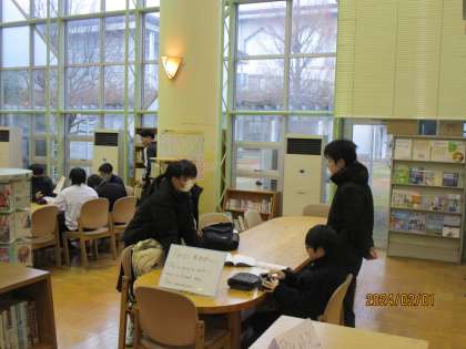 朝の図書室では、友達同士が集まって、勉強をしています。