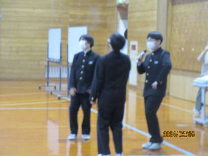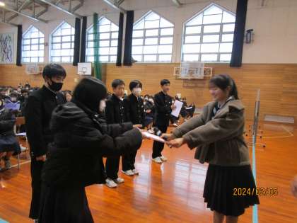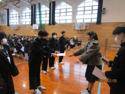 クイズの正解率が高かった各学年のクラスに、生徒会から賞状が授与されました。