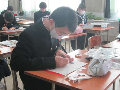 ランプシェードの製作で、「使用状態をイメージして配色する」という課題でした。どの生徒も集中して作業していました。