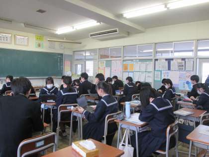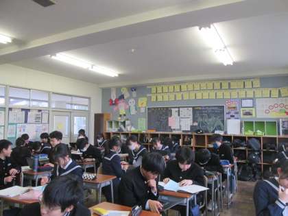 学年末考査の試験範囲が終わったので、自分の課題に取り組んでいるところです。苦手な問題をもう一度やってみるなど、どの生徒も集中して取り組んでいました。