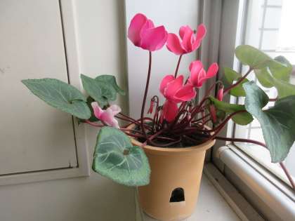 3年4組前洗面所のシクラメンですが、この週末の暖かさで一挙に開花しました。