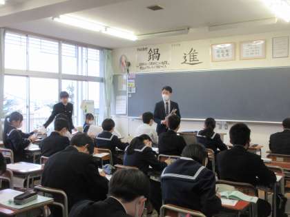 明日から始まる学年末考査に向けて、さらには入試に向けて実践的な問題に取り組み、教科担当者の解説で振り返りを行っています。