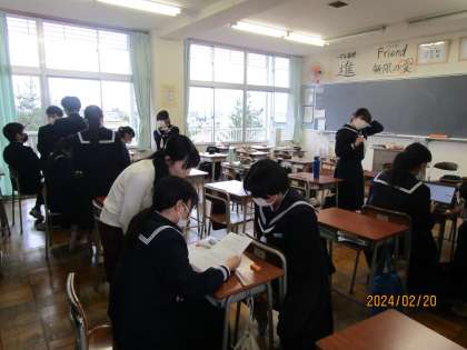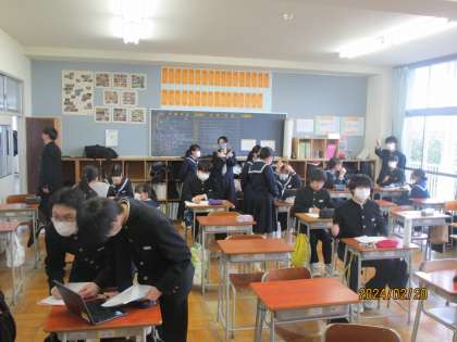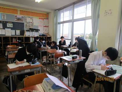 2月20日(火) 3年 昼休みの教室 公開日 2024/02/20 更新日 2024/02/20 3学年 3年生の昼休みの教室では、先生と話す生徒や学習を自分のペースで進める人、友達と談笑する姿等様々です。 中学校のクラスメイトと過ごす日々もカウントダウンですね。