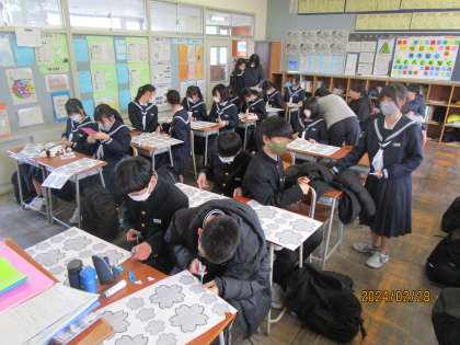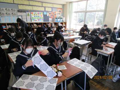 1年生では、卒業生を送る会に向けて、準備がスタートしました。今日は1年生の有志が集まり、メッセージカードを作成しています。