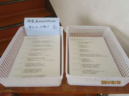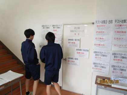 3年生の階段踊り場には、受験勉強に役立つプリントコーナーが設置されています。