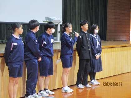 3月11日(月) 卒業生を送る会 公開日 2024/03/11 更新日 2024/03/11 生徒会 生徒会執行部からは、1年生からの思い出のシーンをスライドで振り返り、先輩方にメッセージを伝えました。 お返しに、3年生代表から挨拶をもらい、伝統のバトンが受け継がれました。 心が温かくなるような素敵な会になりました。
