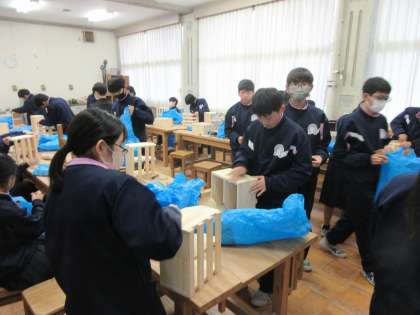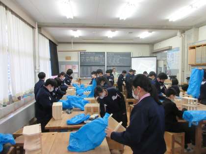 本日の3限目の授業の様子です。 教科は技術で本棚組み立ての仕上げ作業をしました。