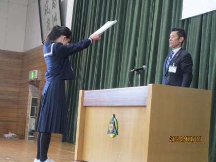 3月13日(水) 修了証授与式 公開日 2024/03/13 更新日 2024/03/13 3学年 第3学年の修了証授与式を行いました。3学年代表生徒が代表してもらいました。 3年生は引き締まった表情で、式に臨んでいました。