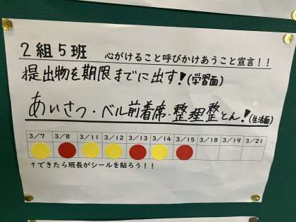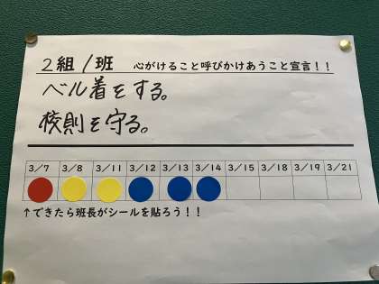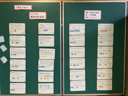 1年生では、学年の締めくくりに向けて、各班で目標を立てて達成できたらシールを貼ります。