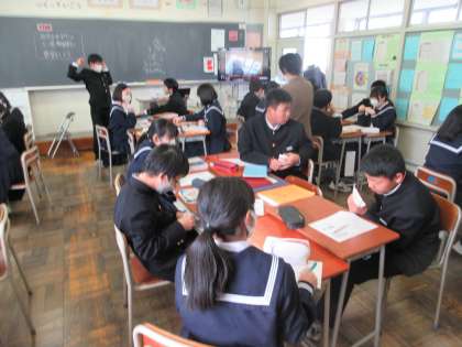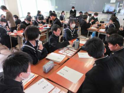 3月19日(火) 1年3組 授業風景 公開日 2024/03/19 更新日 2024/03/19 1学年 本日の3限目の授業の様子です。 教科は家庭科でカルテットカードゲームで食物分野の復習をしました。