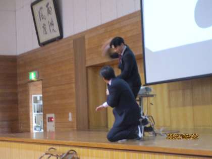 3月22日(金) 令和5年度 修了式 公開日 2024/03/22 更新日 2024/03/22 news 鍋田校長からの式辞です。4月1日から、新たな学年になります。 2年生は春休みに3年生としての自覚をもってせいかつしましょう。1年生は先輩としての自覚をもって生活しましょう。 修了式後は、生徒指導主事から、春休みの過ごし方についてお話しました。劇なども交えて伝えた春休みに大切な4つのこと、「約束」「リズム」「RE START」「STEP]を忘れずに!