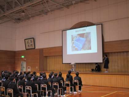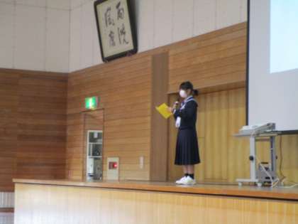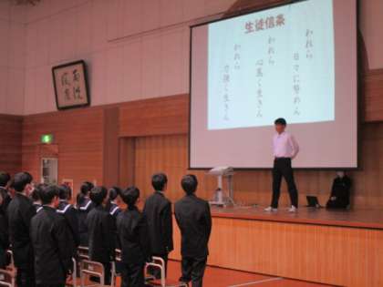 生徒会入会式を行いました。全校生徒で生徒信条を朗読した後、生徒会活動の意義や各委員会の活動についての紹介を新入生は真剣に聞いていました。これからは474名で活発な生徒会を運営していきます。