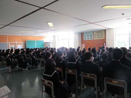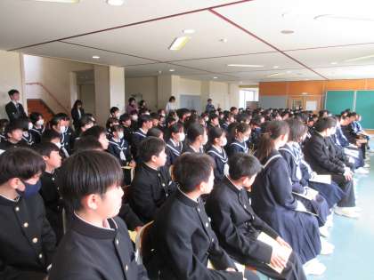 1年生は初めての学年集会です。 整然と入場し、学校生活についてしっかり話を聴いていました。