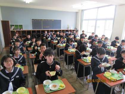 中学校初めての給食の味はいかがでしたか?クラスメイトと食べる給食は格別においしいですね!