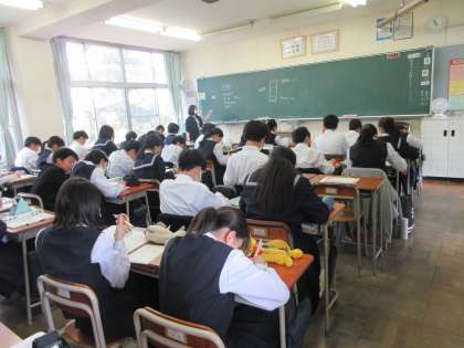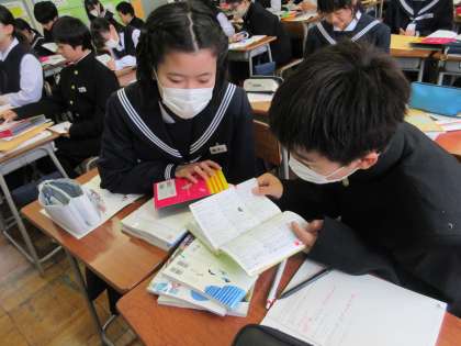 写真上段:1年1組は、国語で文学的文章の山場について考えました。