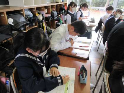 写真下段:1年2組は、数学で正負の数について問題に取り組みました。