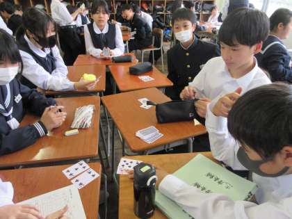 写真上段:1年3組は、数学です。トランプを使って正負の数について考えました。