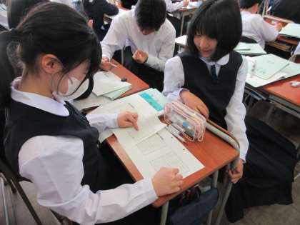 写真上段:1年3組は数学で、正負の計算の学習が始まりました。お互い確かめ合いながら計算しています。