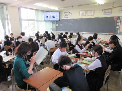 2年2組 英語の授業の様子です。 ペアで単語や熟語の確認をしています。