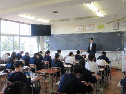 写真上段:3年1組 社会の授業の様子です。集中して先生の話を聞いています。