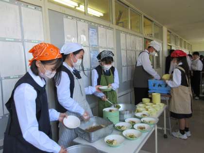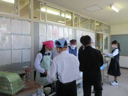 おいしそうな給食。早く「いただきます」ができるように、みんなで協力しています。