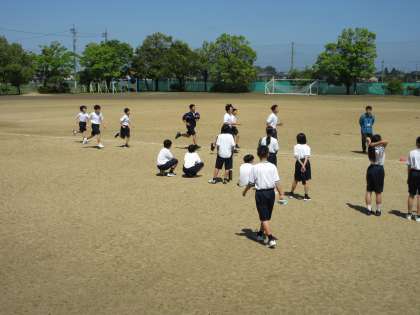 写真下:1年2組 保健体育の授業です。長距離走を頑張っています。「頑張れ!」「あと◯周!」と声が掛かっていました。