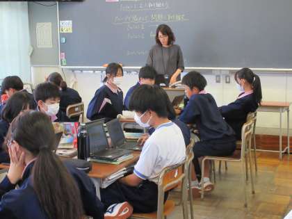 写真下:2組 英語 教科書のミッションについて班別に取り組んでいました。