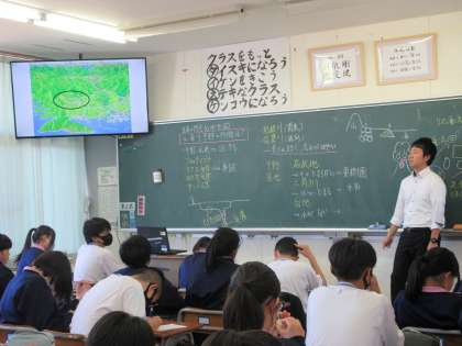 写真下:4組 社会 日本の特色 地形 山、河川、平野の特徴は何かを学びました。