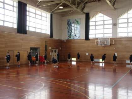 写真上:3年1組 体育の授業風景です。バレーボールのトス練習をしています。